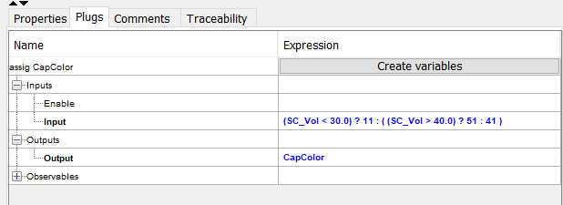 Testing first if SC_Vol is smaller that 30.0, in which case the assigned value will be 11, else there is a second test SC_Vol > 40.0, in which case the assigned value will be 51, else 41. For this kind of complexity in the expression, you can use “Assignment” from the “References” Tab in the object palette. When using “Assignment, a local variable shall be created of the type of the plug that you want to control, also connected to the output of the assignment. The input of the assignment will be the expression as described above.