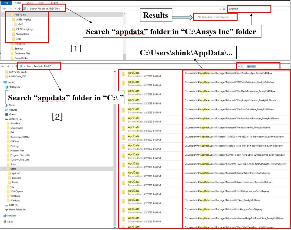 I tried to find the "appdata" folder in [1] "C:\ Ansys Inc"Â and [2] "my computer:\ C:\ and D:\...." , but I couldn't find the "appdata" folder related to ANSYS as an attach file.