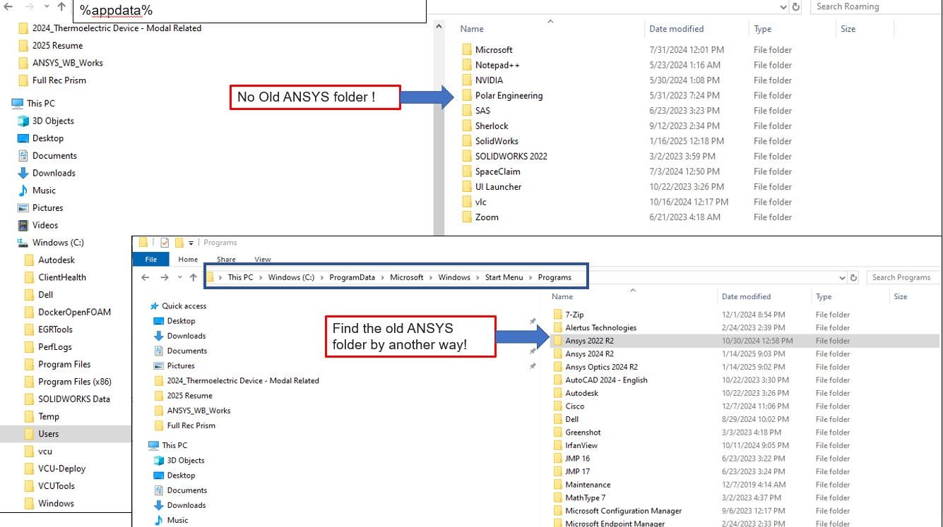 Using the "appdata" , there was no ANSYS folder like your picture, the other hand I found the old Ansys folder as "ANSYS 2022 R2" as an attach file.