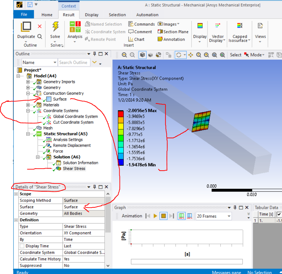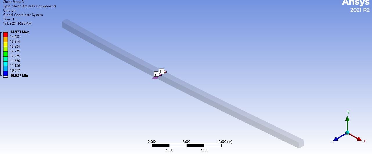 Ansys EmployeeIt may be instructive to look at the calculated nonuniform distribution of the xy shear stress over the cross section of the beam by mapping it onto a construction surface.