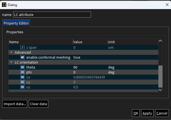 I set the xz plane (out of plane) director orientation for 60 degrees (fig. 2 and 3), but I keep getting this warning (fig. 4). It seems that only in-plane orientation (changing phi) is allowed; whenever theta is set with values other than 0 and 90 degrees, the IDE will give this warning.