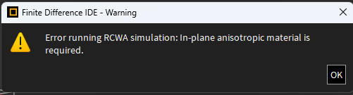 Currently, the RCWA solver supports only in-plane anisotropy. Please refer to the RCWA Solver Introduction under the Supported Materials section.