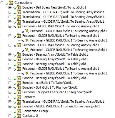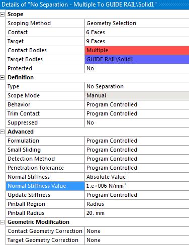 SubscriberOkay , I will do that , In reality the balls of carriage have a stiffness of 600000000 N/m and a coefficient of friction of 0.025. Also the joint translates . Would all these conditions be met by no separation contact? I see there is no friction in no separation contact and you recommend not to keep the stiffness too would that not deviate from real boundary conditions ?