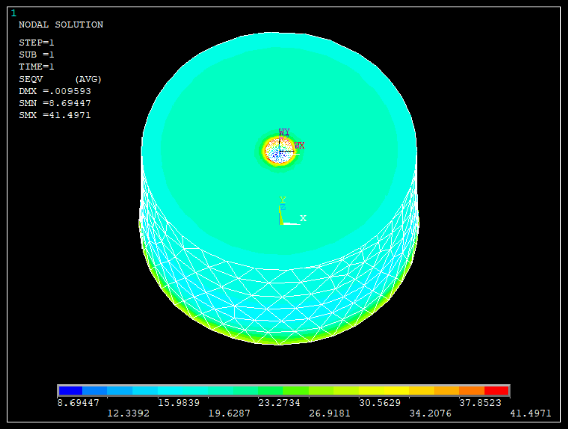 SubscribernHello Keyur,nyes I can provide some pics if this helps. Since the spherical void is the region of interest, the mesh there should be fine. In order to use fixed sized mesh, the element size have to be very small and I can only use 8gb. I have used the smartsize command [smrt,1] for this problem, which gives good results and the void region mesh is also fine. I can find out the number of elements used ( LIST -> elements), but I also wanted to know the smallest element size used after the calculation. If there is way to find that out, i would be very thankful. The script with the commands are the following:n/clearn/prep7nET,1,solid187Â Â Â Â Â Â Â Â Â Â Â Â Â Â Â nMP,EX,1,205000Â Â Â Â Â Â Â Â Â Â Â Â Â Â Â nMP,PRXY,1,0.33Â ncyl4,0,0,50,,,,100nlocal,11,0,0,0,50nwpcsysnsph4,0,0,5nvsbv,1,alln!ESIZE,2.5nSMRT,1nVMESH,3n!EREFINE,ALL,,,1nSFA,2,,PRES,-20nDA,1,ALLn/SOLUnSOLVEnFINISHn/POST1nWPOFFS,,,2n!WPROTA,0,0,0n/CPLANE,1Â Â Â Â Â Â Â Â Â ! Cutting plane defined to use the WPn/TYPE,1,5Â n/EDGE,1,1,45nn