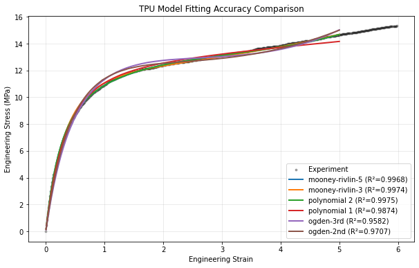 Following the procedures outlined in international journals, I calculated the coefficients of determination between the simulation results and experimental data for each model to determine the most suitable hyperelastic material model for this TPU material.