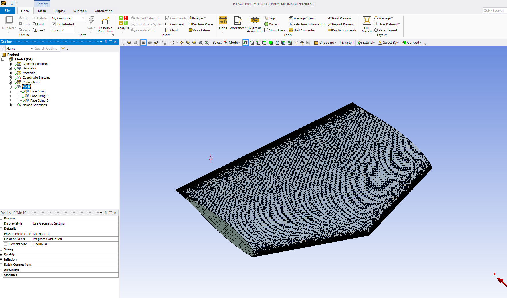 I am currently working on a hydrofoil model using a NACA 63412 profile. I designed the geometry in Rhino 3D, then imported it into ANSYS SpaceClaim, and proceeded with the laminate definition in ACP (Pre) using shell elements for the foil surfaces.