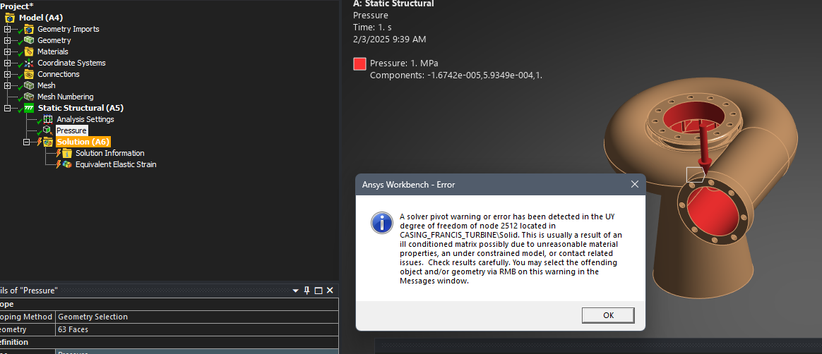 It seems like you are applying some pressure boundary condition without any fixed support or any other fixity.