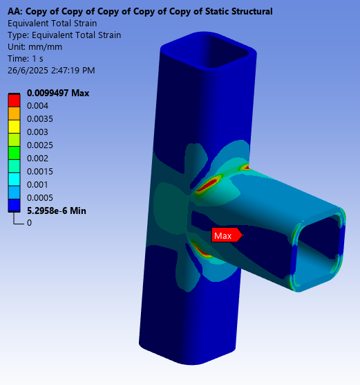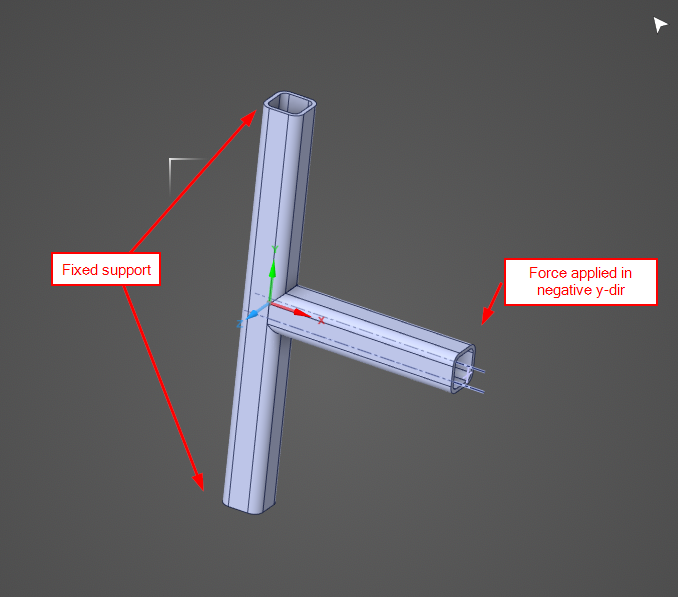 Two SHS 50X5 joined together as a T joint. Two ends are fixed and load is applied onto the remaining end.