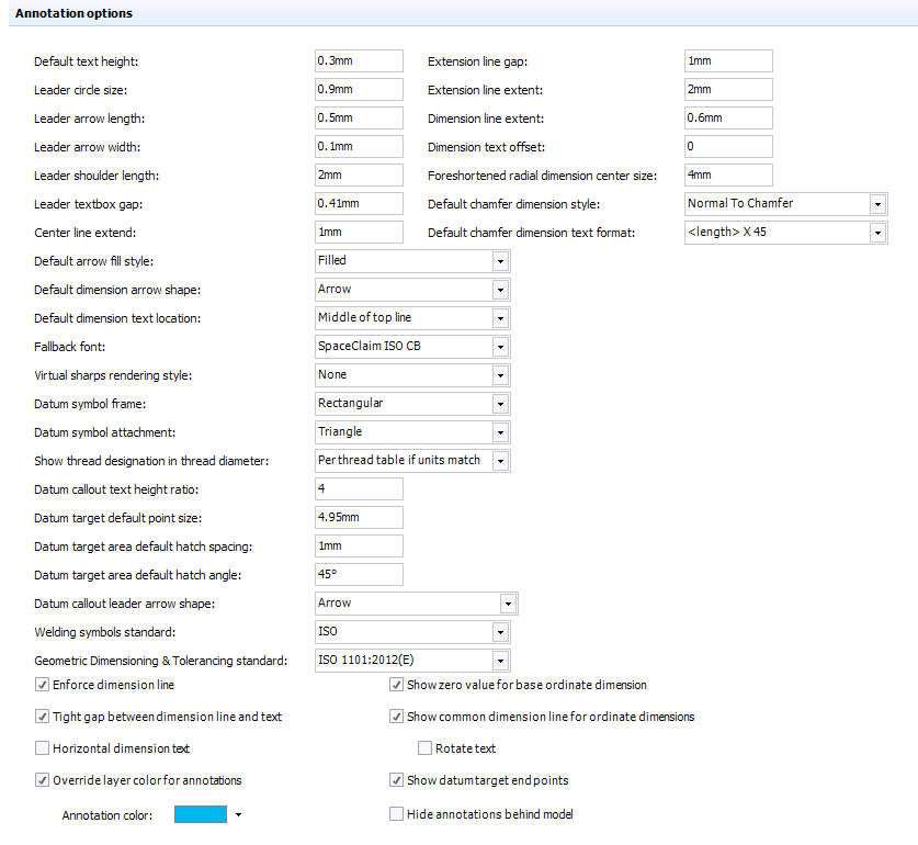 You go to File> SpaceClaim Options and under 'Detailing> General' Annotation options and Linestyle options, you can customise them as required.