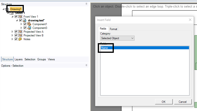 For example, Clicking on 'Drawing 1' as shown in the below image will suggest the parameter 'Name'.Â
