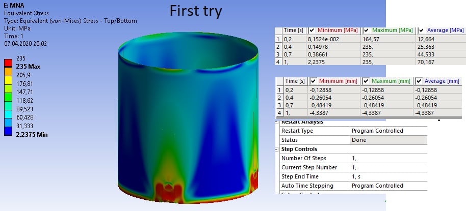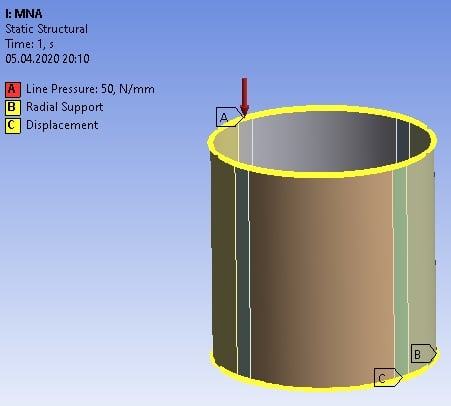 In my example I'm increasing linear load on the top ring during solution until it achieve 50 N/mm.