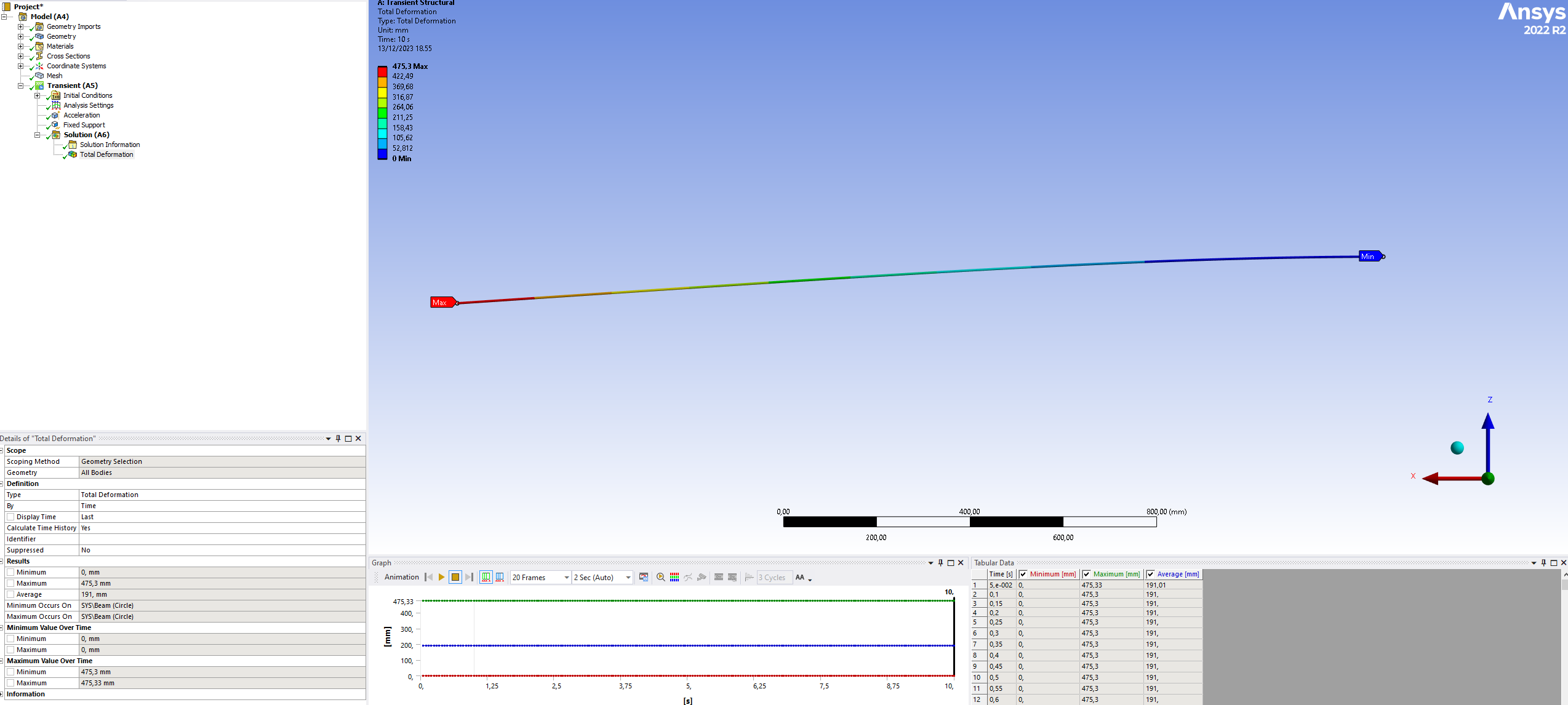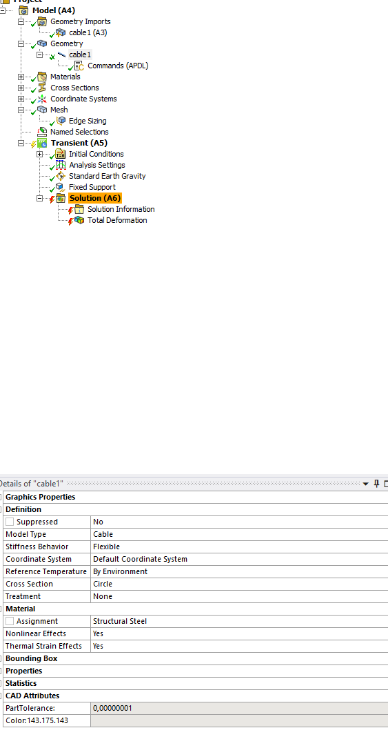 How can the attached model be configured to bend in the same way a 5 mm steel cable bends under the influence of gravity when attached horizontally at one end? The cable should bend almost straight down from the attachment point. It is likely necessary to initially define the element type to be similar to Cable280, but I'm not exactly sure how to do it, and I haven't found an example. Could someone provide guidance or add an example to the attached model on how to achieve this? I'm using Ansys 2022 R2.