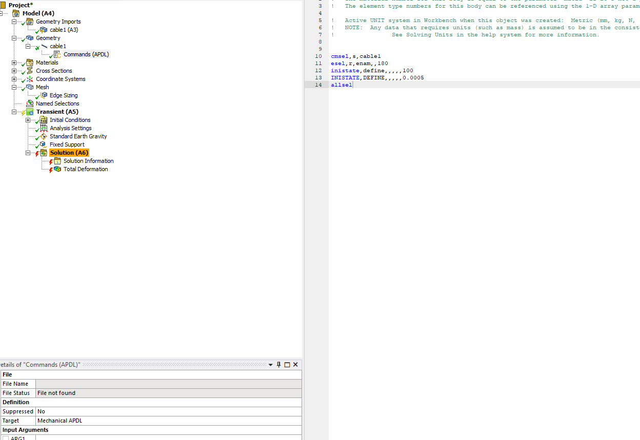 We never mentioned to include any apdl command snippets, as most likely you do not know what these commands mean and do (so would advice against things that are not understood like apdl snippets). So avoid using this – on the other hand if you want to learn some of apdl, which can be good, see here: /courses/index.php/courses/intro-to-ansys-mechanical-apdl-scripting/