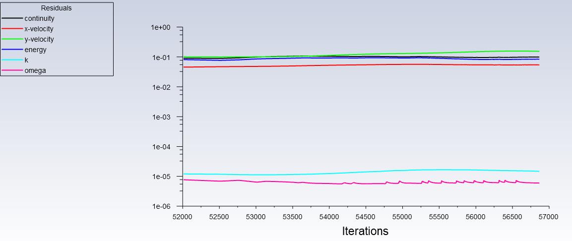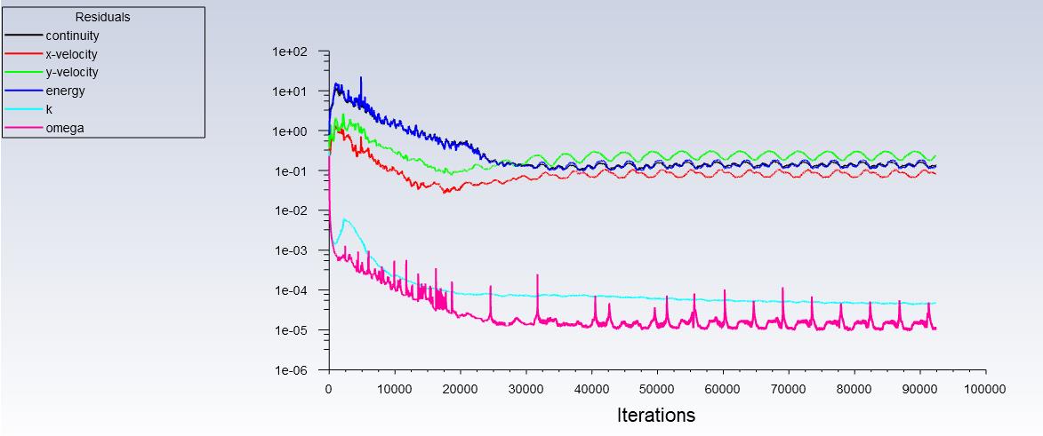 I am glad that you were able to work things out. The default setting for convergence is for the residuals to fall below a threshold of 1e-03. If there is any unsteadiness in the flow, the residuals generally start oscillating. This behavior is usually the cue for conducting a transient analysis to check for the cause of unsteadiness. If you know for a fact that you should get a stead-state solution, but the residuals are flat/oscillating instead of monotonically going down, I would recommend reducing the under-relaxation factors for the 'higher' residuals and checking if that helps stabilize the simulation and take it to convergence.Â