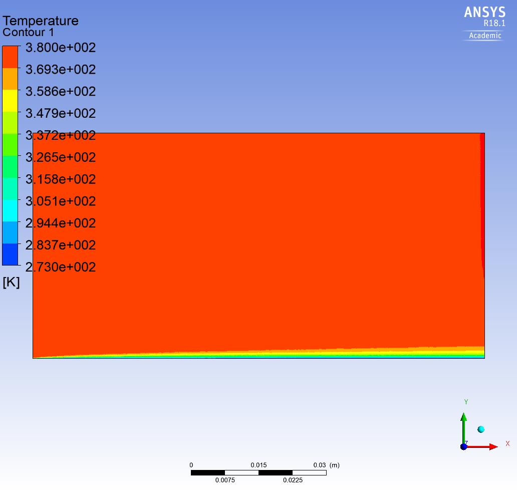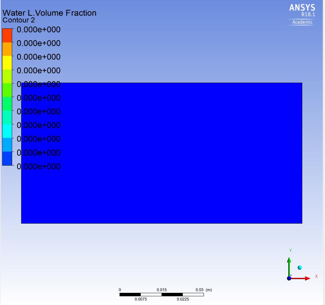 I am trying to simulate condensation on surfaces using Fluent 18.1 in 2 dimensions. I've run into a bit of a problem regarding this. I've set it up so that there is an inlet, an outlet, a condenser, and a symmetric edge, where vapor at 380 K and 5 m/s enters the control volume, and the idea is that there should be condensation on the condenser as it is 273 K. After 1000 timesteps (each 0.001 seconds), the volume report says that there is no liquid in the simulation, and in post, the contour of liquid volume fraction is completely blue, corroborating this. However, when I look at the contour for temperature, it follows a pattern which suggests that water should be condensing in a film. I am using the VOF model for multiphase, with 2 phases, the first being vapor and the second being liquid, with 1 mass transfer through evaporation condensation at default values (saturation temp of 373.15 K, etc). I have tried simulating over a longer period of time, but to similar results. Is there anything wrong with my model? How can I fix this so it makes sense? I will include a couple pictures for reference.Â