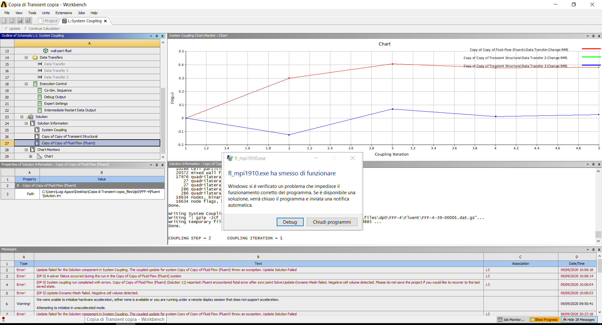 SubscriberThanks for the reply. nI am using a remote desktop connection, and yes before the analysis stops, I have this problem (see image). Sorry for the italian language, but the error says that fl_mpi1910.exe has stopped working. This occurs only when the coupled analysis is launched with fluent in parallel. nWhen I open fluent in serial, this problem doesn't come up, but I have another problem regarding Update dynamic mesh failed. Negative cell volume detected.n