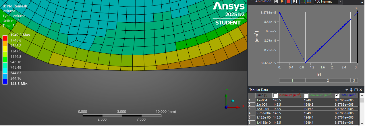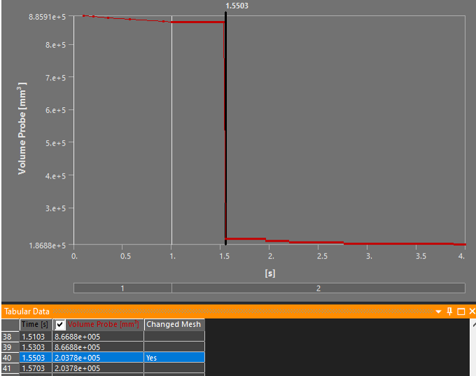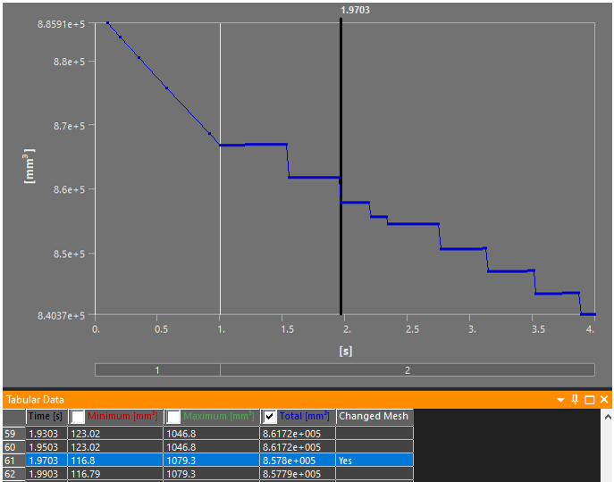 Step 1 showed a linear reduction in volume as the compressive load ramped on then a stair-step reduction in volume upon each remesh. Between remesh events, the volume increases slightly which is odd.Volume Probe Result