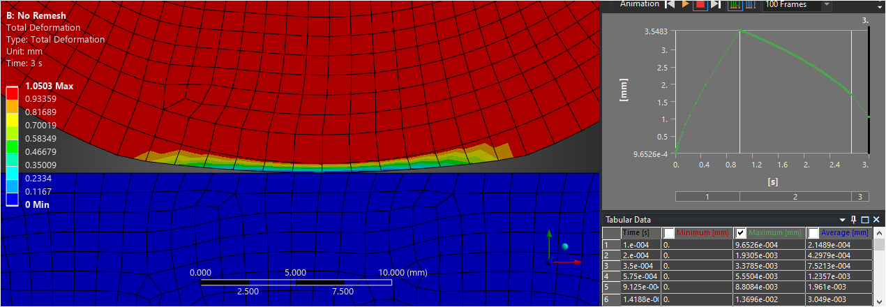 From the Total Deformation at the end of step 3, the wear depth at the center is seen to be 1.05 mm.