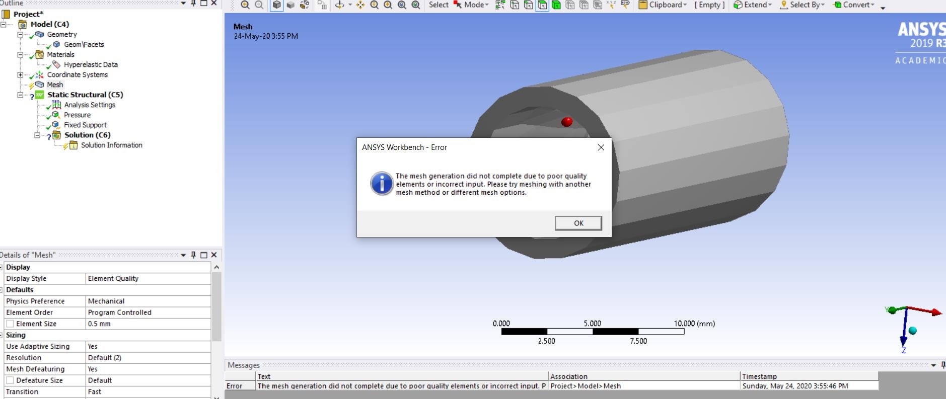 I am a new ANSYS user and i keep receiving this error message for my geometry when i try to mesh. This is an imported geometry i made in 3dsmax and i am trying to do some FEA on an atherosclerotic artery.