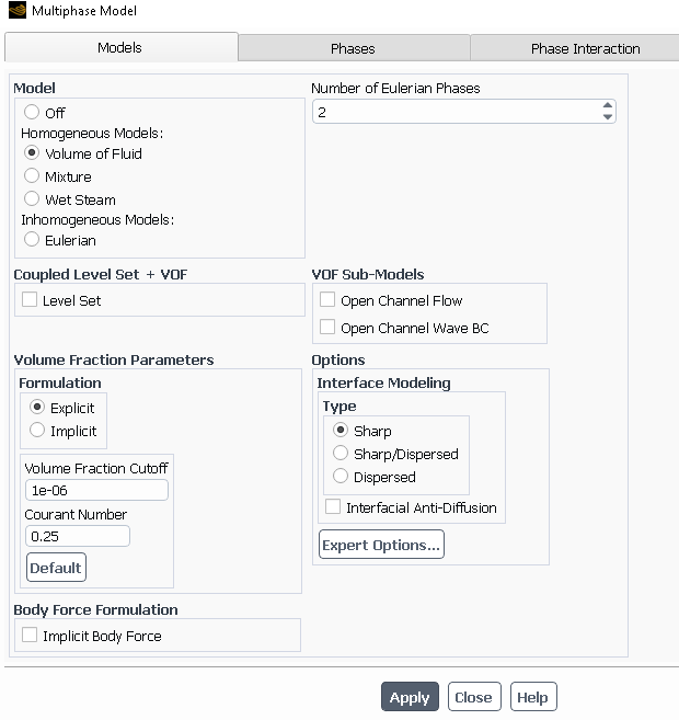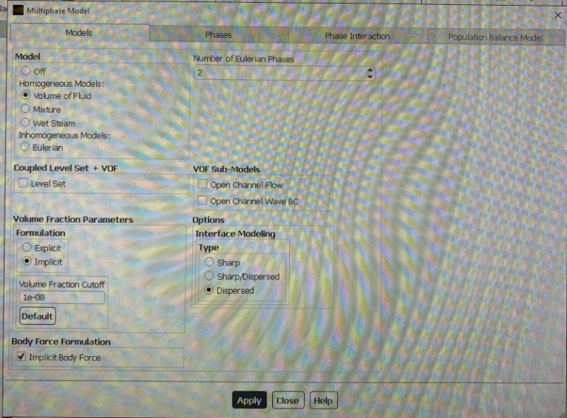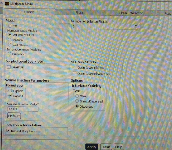If I don't enable the VOF model and run the system on water or gas only, everything works fine. But as soon as I enable the VOF and phases, I get an error.