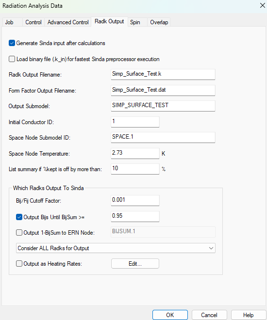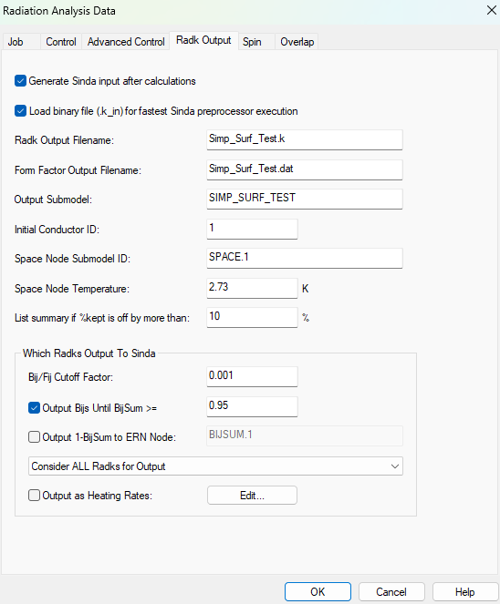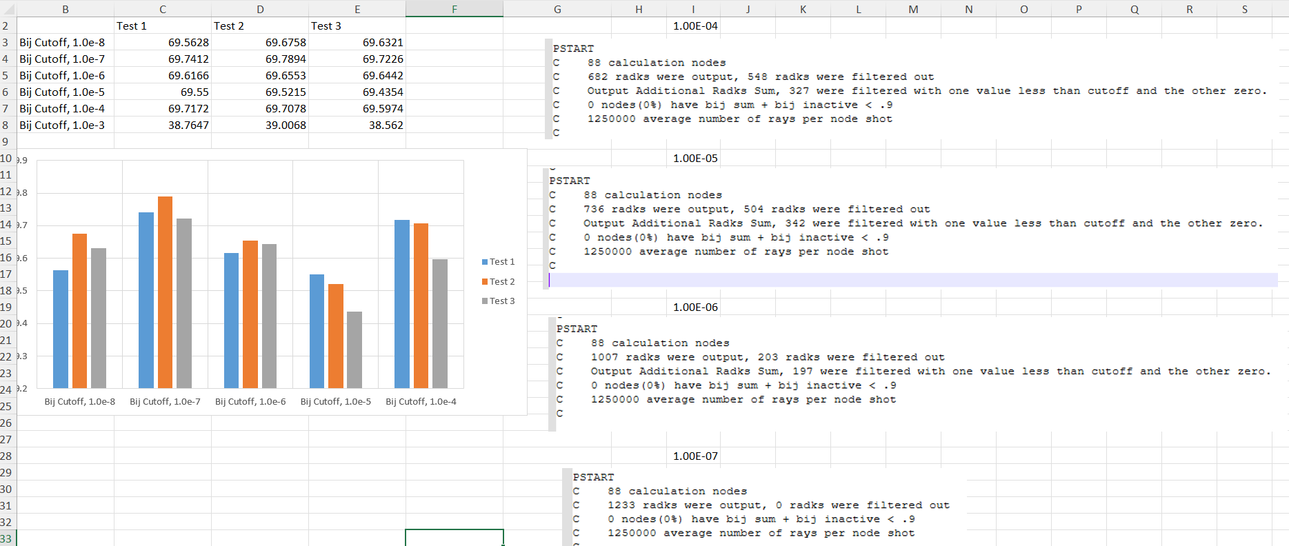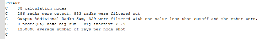 Ive attached a screenshot of the Radiation Tab "Radk Output" tab in case it would be helpful, alongside the requested screenshot of the .k file. It does seem as though a large ratio of radks were filitered in both cases, which seems like a good insight on your end. While the value of 0.001 I currently have is close to the recommended 0.0013 (1/740), Ill look into running some cases with smaller cutoffs and see if this produces a converging result.