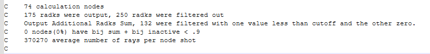C Â Â 50000 average number of rays per node shotMy first guess is that the Bij cutoff factor (on the rak output tab of the radiation task) is too high resulting in a relatively large number of filtered radks. The Bij cutoff prevents overly full matrices with extremely low values. The more nodes that are in the model and the lower the emissivity of the surfaces, the lower the Bij cutoff should be. A good starting point is the inverse of 10x the number of calculation nodes. From there, you will want to decrease the value until the solution stops changing.
