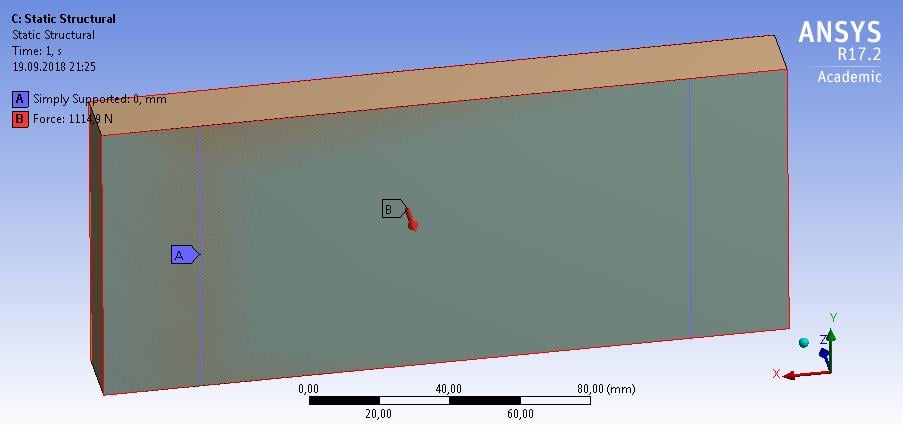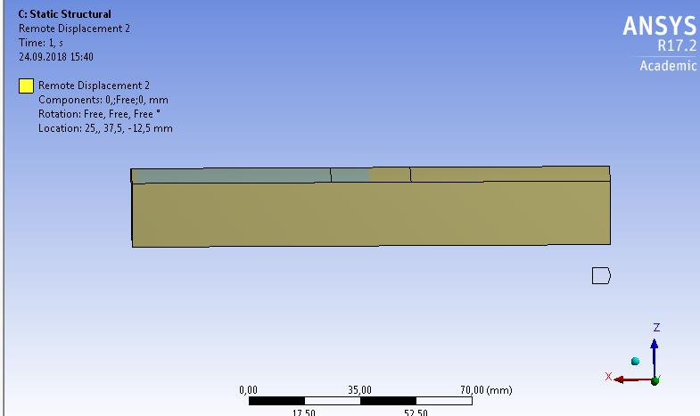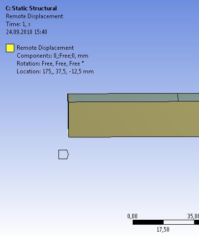 Remote Force Applied in an Area : 25x75 , force direction along Z axis, Scope from point in the center and 12,5mm above the upper face, Behavior: Deformable: