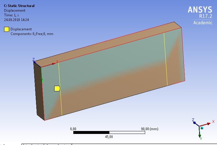 Because in reality the supporting bars will result to an area of contact with the panel and not a line I also did a simulation where the displacements were set on two faces of an area 12,5x75 (diameter of 12,5 rollers bars) and not on a line, and of course I had different results: upper face w_tot = 0,089 mm and lower face w_tot=0,083mm..