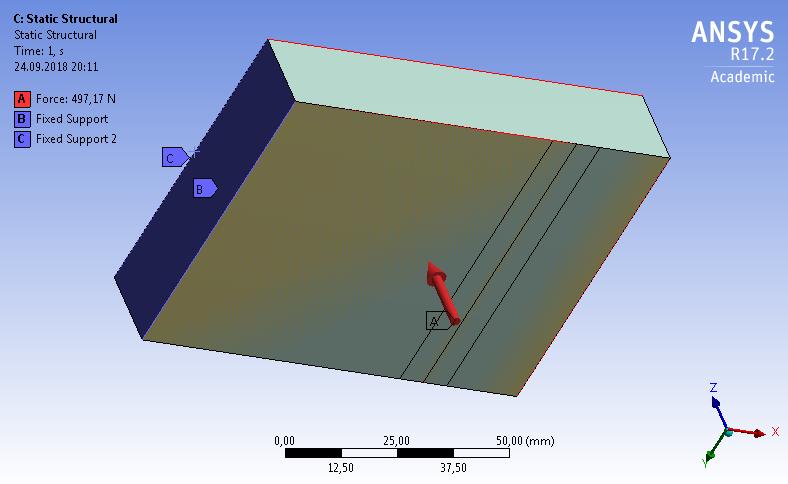 Afterwards applying only a Z=0 displacement on the corresponding line and a normal force of F/4 on the corresponding face I get: