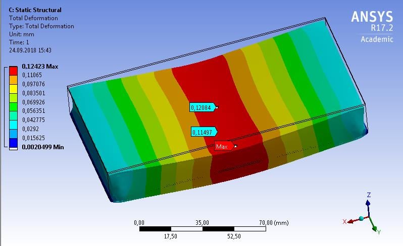 Results in total deformation, z = 0,124 upper face at the center /Â z = 0,115 under face at the center: