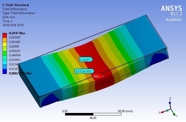 Results in total deformation, z = 0,102 upper face at the center /Â z = 0,096 under face at the center: