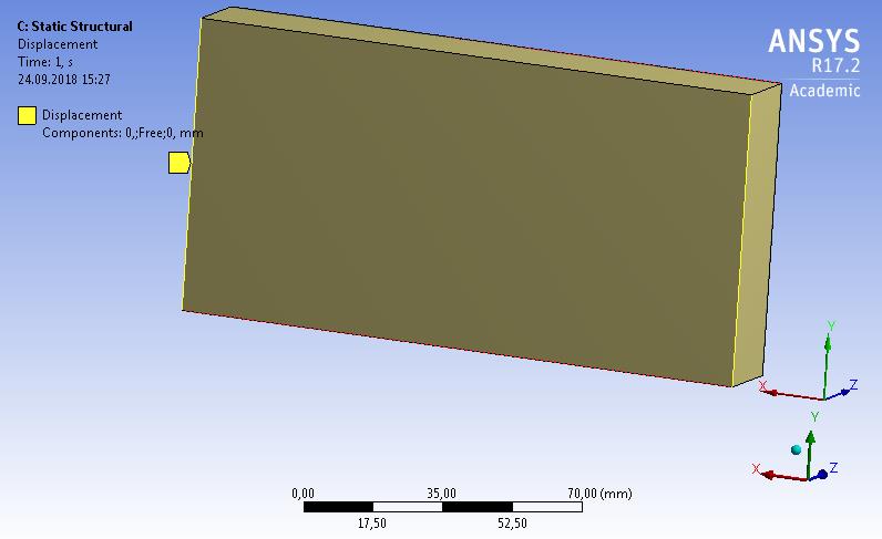 (3) Since the two symmetry planes stopped the model from moving anywhere but vertically along the Y axis, you can easily create a "roller" on the 150/2 mm end of the sample by picking the edge of the face place and just applying a Y = 0 displacement support. That is a roller since you are leaving X free.This is a completely linear model so it will solve very quickly.