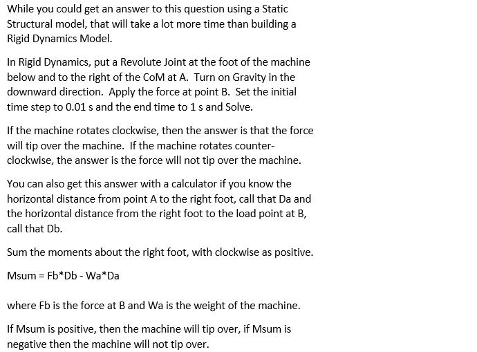 The attached image shows the shape of the machine. Point A shows centre of gravity. Load of 150kg is to be applied at Point B. Is it possible to simulate in Ansys that if the load is applied will the machine tilt towards right side or not?