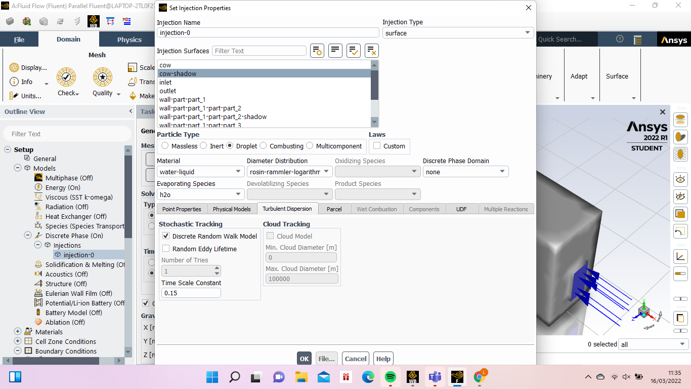 Injection= surface, particle type= droplet, material= water liquid, evaporating species= H20, diameter distribution= rosin- rammler.