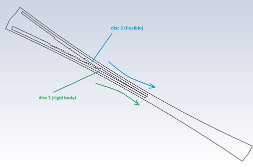 SubscriberThank you for your answer. In the following, I put some photos with explanations. To clarify, each of the objects is a part of a disc which rotates.n(Please note that here I'm showing the ideal case where the motions are all defined by Mesh motion. As the Fluent cannot receive the Location, I have changed the model so that the meshing for disc 2 is stationary and instead, the wall movement for that disc is solely caused by Structural. I wished there was a better solution ? )nAll solid objects and the domain are shown in the below picture. Arrows indicate the directions for rotations.n
