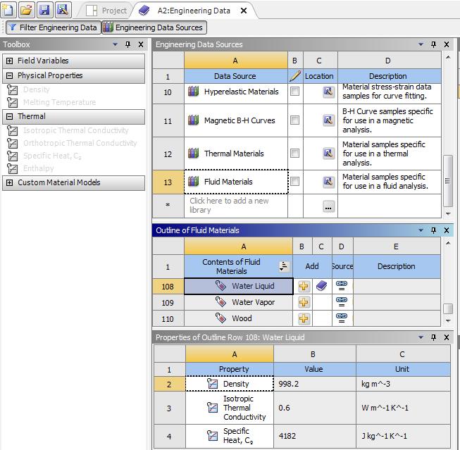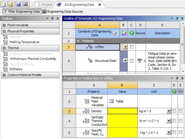 Double click on Engineering Data, a new tab will open in Workbench. Click on the box under Structural Steel and type coffee. The Toolbox on the left has been filtered to only show properties relevant to a Thermal analysis. Drag and drop on the coffee material Density, Isotropic Thermal Conductivity and Specific Heat.