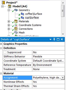 SubscriberThe fluid is coffee. The cup material is HDPE. I'm not sure how to set this up. I'm thinking maybe I should just make the liquid solid and give it the properties of liquid.