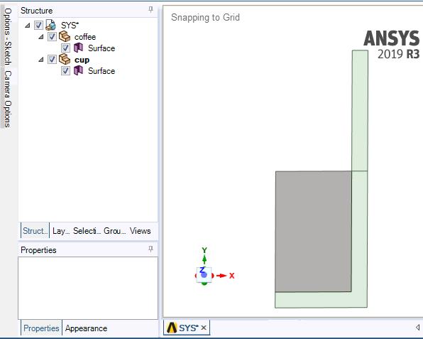 Now double click on Geometry to start SpaceClaim. Sketch a radial slice of the cup on the XY plane on the +X side of the Y axis. Think of the Y axis as the axis of revolution. The surfaces you draw would recreate a solid body if you revolved them 360 degrees about the Y axis. Create a New Component for the cup and draw the L shape. Create a New Component for the coffee and draw a rectangle. My cup is half full. Yours might be half empty : ) Activate the cup Component. Draw a line at the top of the coffee to split the face into two so there can be different boundary conditions.