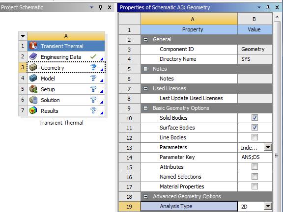 Click on the Geometry cell on line 3 of the Transient Thermal block A. In the Properties window on the right, on line 19 is Analysis Type. Change that to 2D.