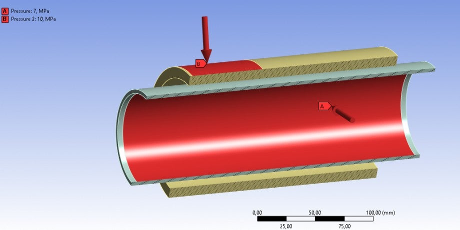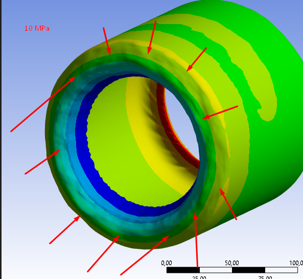 On the inner cylinder, I put a pressure of 7 MPa. After squeezing the rubber, I serve 10 MPa to external rubber, on the edge, so that the rubber is compressed in the other direction and the gap in the pipe becomes sealed.Â