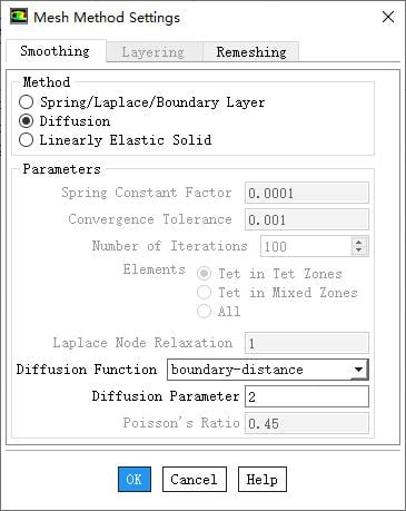 The setup of fluent, smoothing and remeshing are as shown in down below.Â