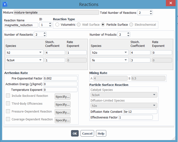 The solid species here are fe3o4 and fe, and h2 and h2o are gasses. The reaction should occur at the particle surface however using the current variables for the arrhenius rate and particle surface reaction is insufficient to describe the process. Hence, I wrote the PR_RATE UDF to describe the reaction rate. This UDF should thus overwrite the reaction rate properties specified in the window above.nAlso, I am currently using a multicomponent discrete phase particle where the solid components have been re-specified. However, in reality these components are equal to the solid species. Therefore I have used the same molecular formula. I wonder though how Fluent should know that it should use these components for the particle surface reaction. Should I use a different particle type or specify my particle components in a different way?n