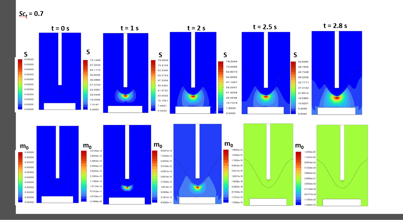 What I am finding is that the m0 value is giving an unphysical value and you can see from the contours that after 2.5 s it just increases out of control and I'm really stuck as to how to control this. Another noticeable is there are negative m0 values, despite supersaturation and nucleation having a minimum value of 0. You mentioned applying a limiter, how would I do this?