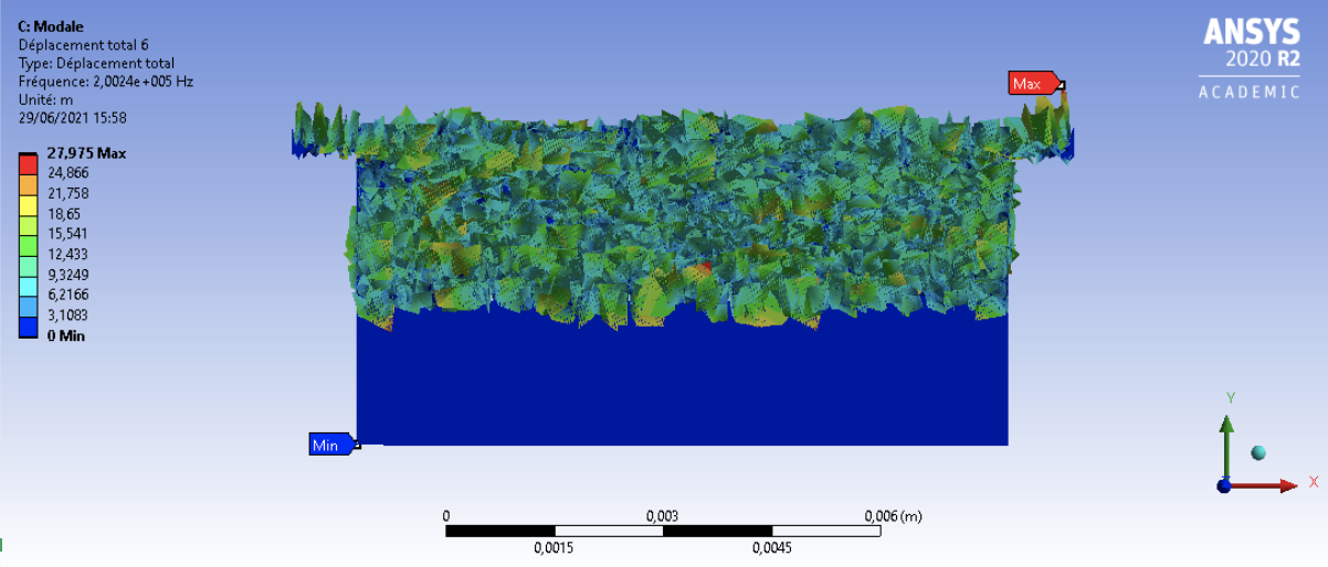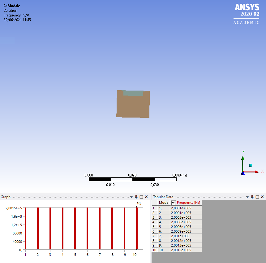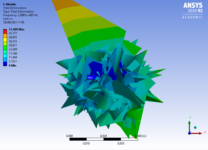 I will first launch modal analysis to then visualise total deformations for different resonance modes, but the results I get don't make much sense : the piezo is absolutely not deformed and the coupling module seem to be too deformed.
