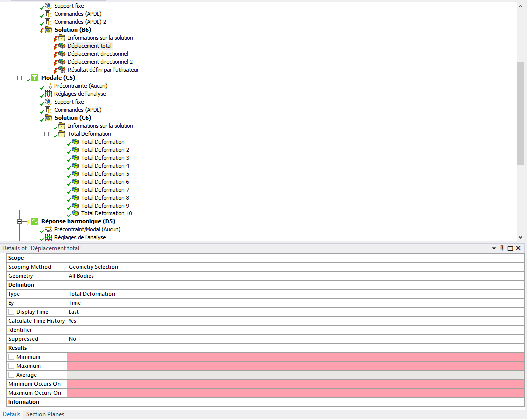 I want to visualise both total and directional deformations as well as the voltage applied on the piezo-eletric ceramic that I am studying. I am unable to solve because I have to input the maximum, minimum and average deformation and when they occur but I am unable to input anything in those specific areas.