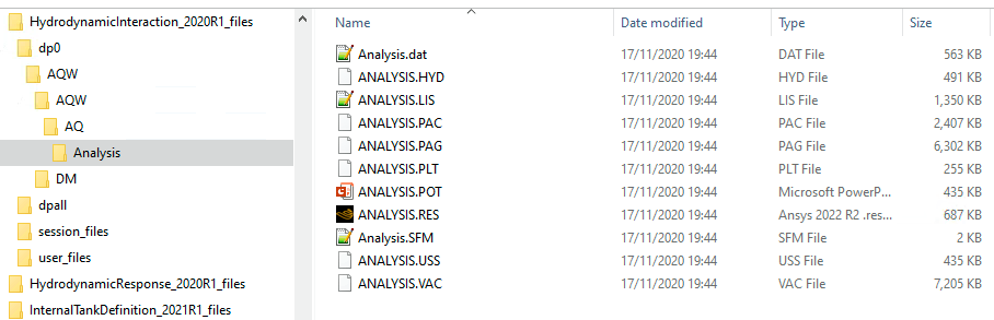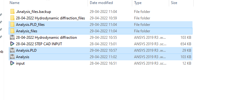 Ansys EmployeeThe Analysis.PLD and Analysis.PLS files need to be created in the 'solver files directory' - this is where the Aqwa solver reads and writes data. Inside the folder '28-04-2022 Hydrodynamic diffraction_files', you will find a folder structure like this: