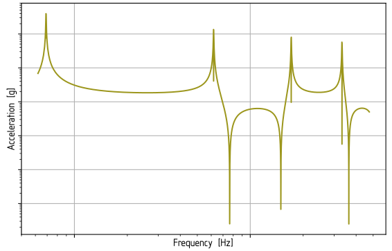 The peaks pointing upwards are from resonance effects. But why have the last three peaks a line pointing downwards? I guess that it is due to damping but why is the line getting longer at higher frequencies? And what about the peaks pointing downwards? Are those frequencies where the structure is not susceptible to vibration?