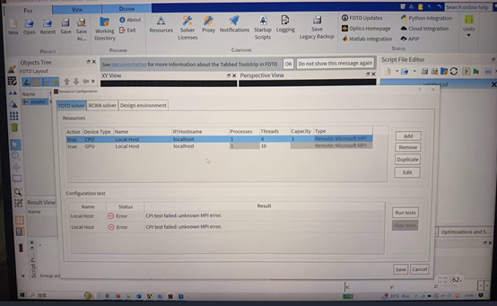 unknown MPI error,What caused this error and what should I do? The FDTD software opens normally, other modeling works fine, but it doesn't work. It doesn't report any errors during execution, it just exits directly without data.