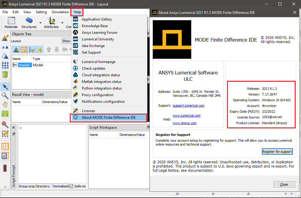 To assist you better, please share a screenshot of the Lumerical CAD > Help > About... page, similar to the one in this image.