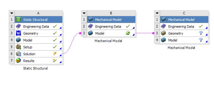 Forum ModeratorWhich version are you using? You can connect the solution cell of the analysis where you have the deformed model to Model cell of the Mechanical model and in turn connect it to Geometry to get the geometry.